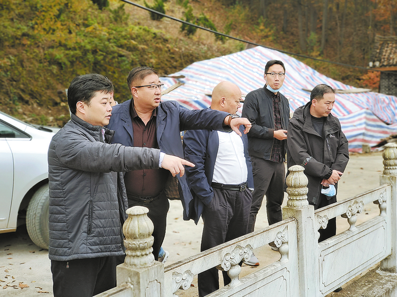 浦口區(qū)對口幫扶鎮(zhèn)安縣聯(lián)絡(luò)組組長、鎮(zhèn)安縣縣委常委、副縣長葉雪峰(左一)陪同江蘇企業(yè)到青樹村考察。
