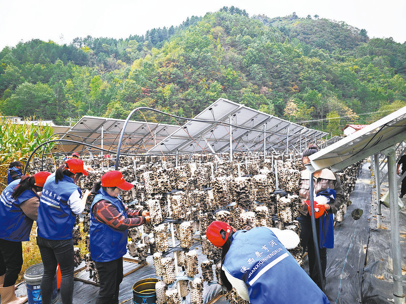 初冬的早晨,暖陽下的鎮(zhèn)安縣大坪鎮(zhèn)廟溝村農(nóng)光互補(bǔ)塔式木耳種植基地景色格外迷人:一塊塊藍(lán)色光伏面板折射出萬千條耀眼光芒,生產(chǎn)的綠色電能正輸送到附近的豐菇源產(chǎn)業(yè)園區(qū);一排排整齊的塔架上,密密麻麻的黑木耳正沐陽而生;三五成群的婦女一邊說笑,一邊嫻熟地采摘肉嘟嘟的鮮耳。