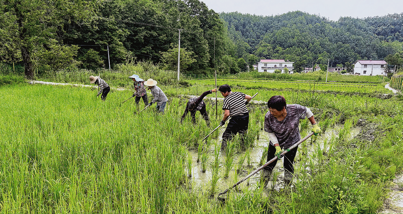6月24日,在嶺溝村的稻田里,村民在辛勤勞作。