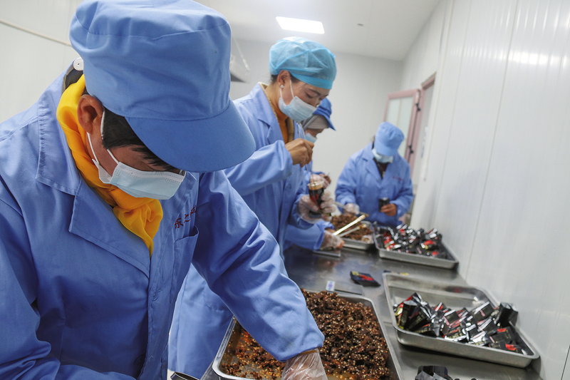 走進公司,馬云珍正忙著打包剛生產(chǎn)的牛肉干。“我家就住在附近,平時除了照顧家里外,就在這兒上班,一年能掙2萬多元呢。”