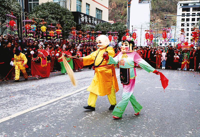 活動(dòng)當(dāng)天,大頭和尚的扮演者張富成與搭檔早早來到現(xiàn)場做準(zhǔn)備。只見他動(dòng)作嫻熟地將道具綁在身上,穿著灰布長衫,戴上大頭和尚的面具,隨后便和裝扮好的搭檔一同開啟了精彩表演。在民族打擊樂歡快的伴奏下,二人踩著固定的鼓點(diǎn),以詼諧夸張的動(dòng)作,生動(dòng)展現(xiàn)出和尚掃地、洗臉、掛畫等生活情節(jié)。整個(gè)表演持續(xù)了20多分鐘,幽默風(fēng)趣、別具一格的演出形式,贏得了現(xiàn)場群眾的陣陣喝彩。