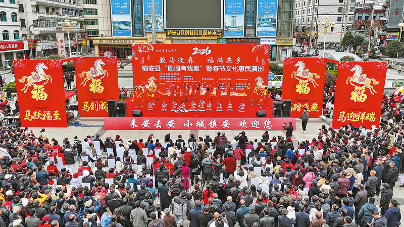 二月二十五日,“駿馬迎春·福滿栗鄉(xiāng)”鎮(zhèn)安縣二〇二六年“周周有戲看”暨春節(jié)文化惠民演出在縣城中心廣場(chǎng)拉開(kāi)帷幕。春節(jié)期間,鎮(zhèn)安縣通過(guò)舉辦一系列接地氣、有溫度的文化惠民演出活動(dòng),在營(yíng)造歡樂(lè)、祥和、文明的節(jié)日氛圍的同時(shí),也讓群眾在家門(mén)口盡享“文化盛宴”。(本報(bào)記者馬澤平 攝)