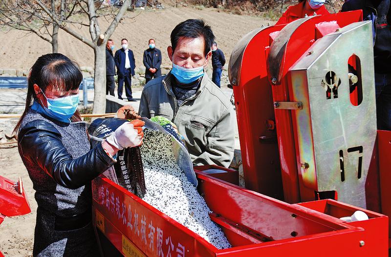 今年43歲的吳積芹是柞水縣紅巖寺鎮(zhèn)閆坪村人,家中6口人,兩位老人年事已高,常年患病,孩子都在上學(xué),丈夫身體也不好,做不了重活,家中的生產(chǎn)重?fù)?dān)都?jí)涸谒蝗松砩?。今春她家種植了4畝地的馬鈴薯,靠吳積芹一個(gè)人的話,得忙活一周時(shí)間??h農(nóng)業(yè)機(jī)械化推廣中心到閆坪村宣傳機(jī)播馬鈴薯時(shí),吳積芹第一個(gè)報(bào)名播種自己家的地。3月18日,市農(nóng)業(yè)農(nóng)村局的馬鈴薯種植專家來到吳積芹家的田頭,給村民講解如何挑選馬鈴薯種和如何激活休眠芽。農(nóng)機(jī)專業(yè)合作社的工作人員將播種機(jī)開進(jìn)吳積芹家的地里,十來分鐘就播種好了半畝地,這樣的速度吳積芹想都想不到。