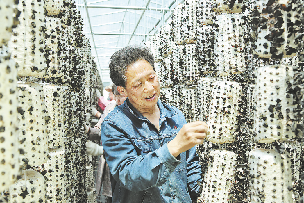 在金米村木耳大棚,村民鄒勝全和請來的幫工正在采摘木耳。