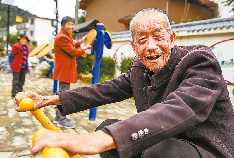 80歲的王治珊老人在金米村健身廣場鍛煉。鄉(xiāng)村產業(yè)的發(fā)展讓村民收入穩(wěn)中有升。說到今天的幸福生活,王治珊老人高興得合不攏嘴。