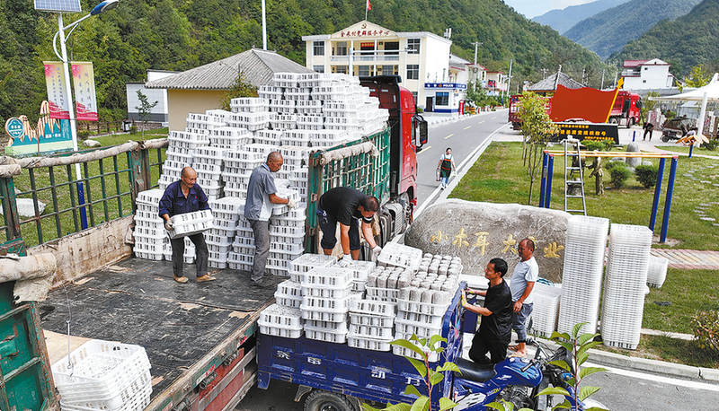 柞水縣融媒體中心主播謝丹(左)、許宗華在金米村直播,助力鄉(xiāng)村振興。