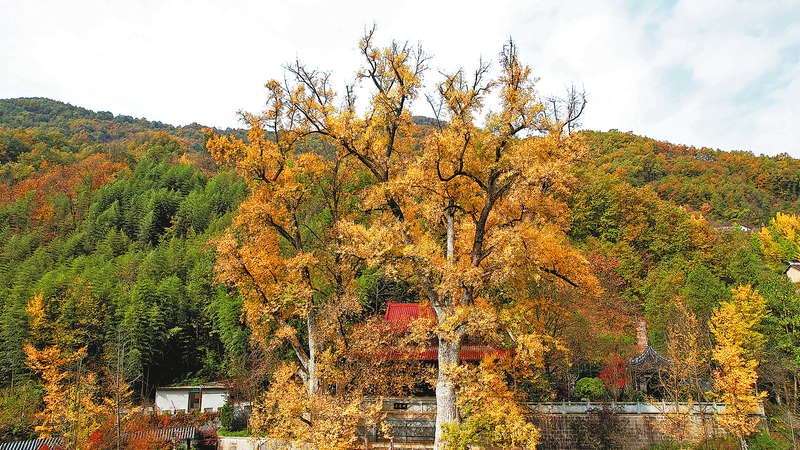 東甘溝銀杏園里,一雄一雌兩棵銀杏樹,相距7米,樹齡均1700多年,根系盤結(jié),枝丫交錯(cuò)。兩棵古樹樹高均超過40米,樹冠直徑30多米,并立的銀杏樹宛如一對(duì)耳語廝磨的情侶,故而稱其為“夫妻”銀杏樹。東甘溝也因“夫妻”銀杏樹,而成為遠(yuǎn)近聞名的銀杏觀賞地。