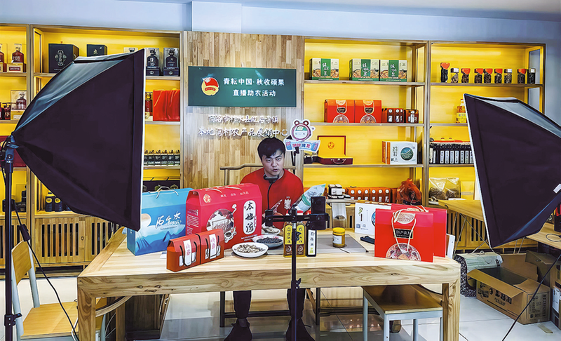 △主播正在直播推介當(dāng)?shù)氐奶厣r(nóng)副產(chǎn)品。