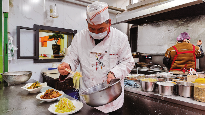 后廚內(nèi)暖意融融,屈勇有條不紊地進(jìn)行備菜。