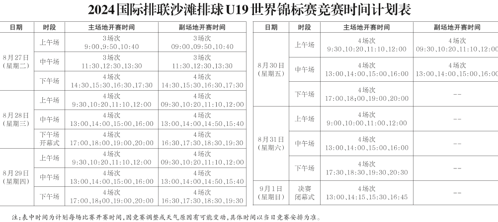1.比賽主場地設(shè)在秦嶺博物館西廣場,副場地設(shè)在商州群眾運動公園沙灘排球場。比賽從8月27日開始至9月1日結(jié)束,共6個比賽日,每個比賽日從9:00至20:30,在主場地1塊賽場、副場地3塊賽場同時進行比賽。開幕式8月28日20:30、閉幕式9月1日17:30在主場地舉行。
